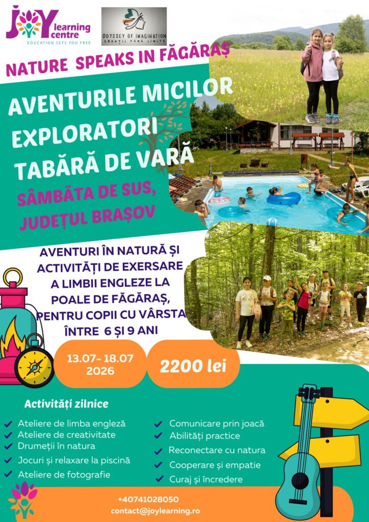 Nature Speaks in Făgăraș – Aventurile Micilor Exploratori e acea poveste care începe când școala se mută în pădure, când limba engleză se învață alergând, cântând și povestind, iar fiecare copil devine exploratorul propriului univers, cu inima deschisă, ochii curioși și pașii pregătiți de aventură.