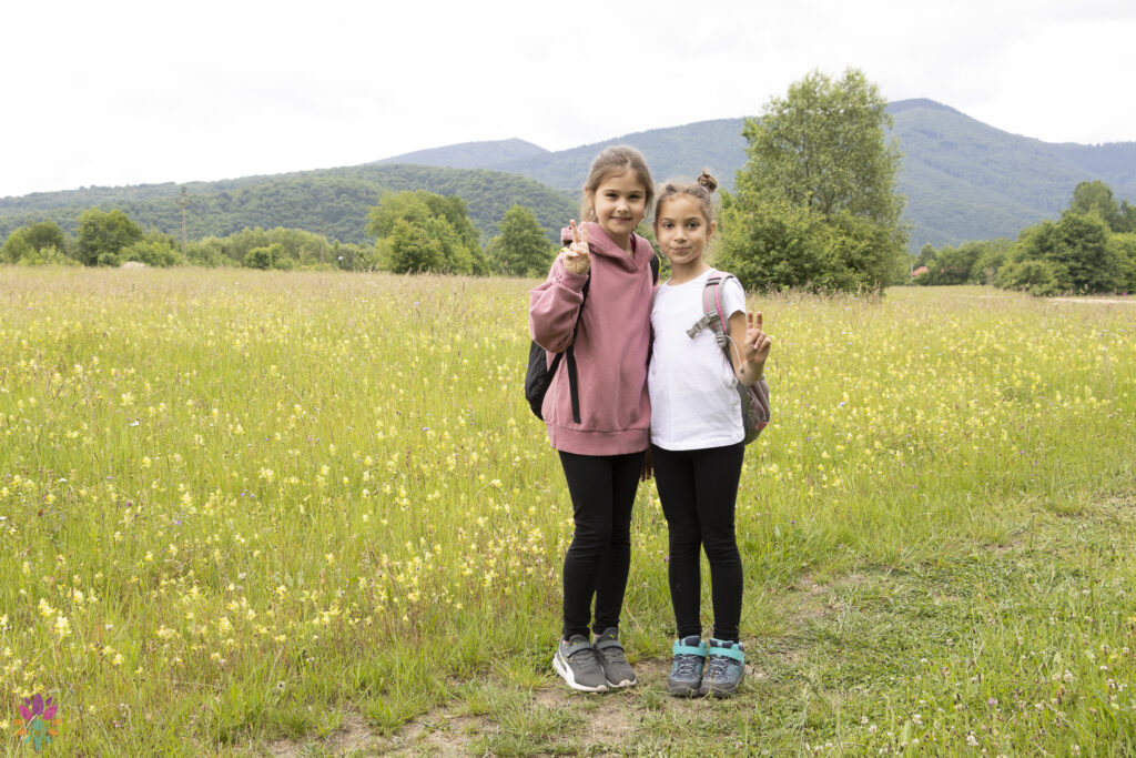 Nici nu am coborât bine din mașini, că cei mici au si zbughit-o pe pajiștea plină de flori din apropierea locului unde aveam să ne tragem sufletul, să ne jucam si să ne bucurăm de soarele cald al după-amiezii. Veselia lor era molipsitoare, iar râsetele răsunau în aerul proaspăt al dimineții. În timp ce îi priveam cum se alergau în iarba înaltă, plină de flori și fluturi, am descărcat toate cele necesare pentru masa de amiază, am pregătit rucsacii pentru drumeția în pădure și după câteva poze am pornit împreună la drum.